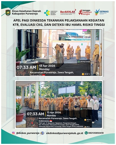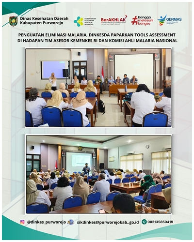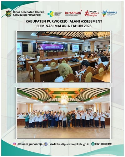 PURWOREJO, 15 APRIL 2026 – Pemerintah Kabupaten Purworejo menerima kunjungan Tim Asesor Eliminasi Malaria dari Kementerian Kesehatan RI dan Komisi Ahli Malaria Nasional dalam rangka pelaksanaan Assessment Eliminasi Malaria Kabupaten Purworejo Tahun 2026. Kegiatan ini menjadi tahapan penting dalam proses verifikasi untuk memperoleh sertifikat eliminasi malaria. Pertemuan ini dihadiri oleh unsur Kementerian Kesehatan RI, Komisi Ahli Malaria Nasional, Dinas Kesehatan Provinsi Jawa Tengah, Dinas Kesehatan Daerah Kabupaten Purworejo beserta Tim Eliminasi Malaria, Camat, Direktur Rumah Sakit dan Kepala Puskesmas se Kabupaten Purworejo serta lintas sektor dan fasilitas pelayanan kesehatan yang berperan dalam program penanggulangan malaria di Kabupaten Purworejo.